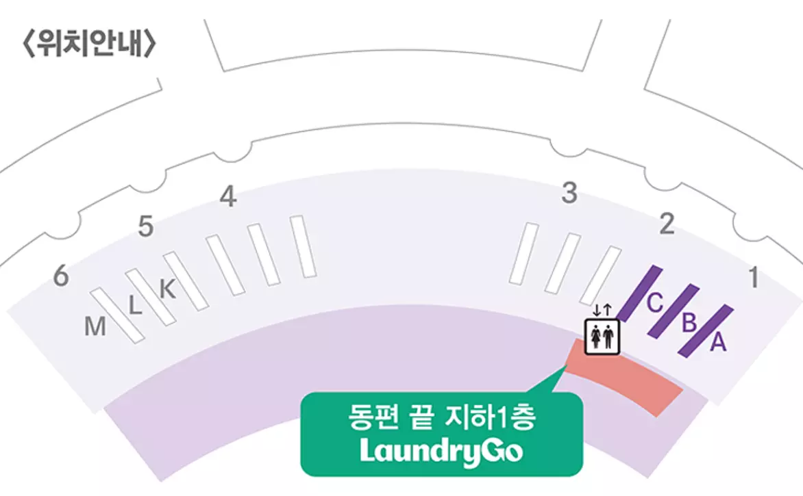 아시아나항공 런드리고 (외투무료보관서비스) 접수 및 외투수령장소는 동편 끝 지하 1층에 있습니다