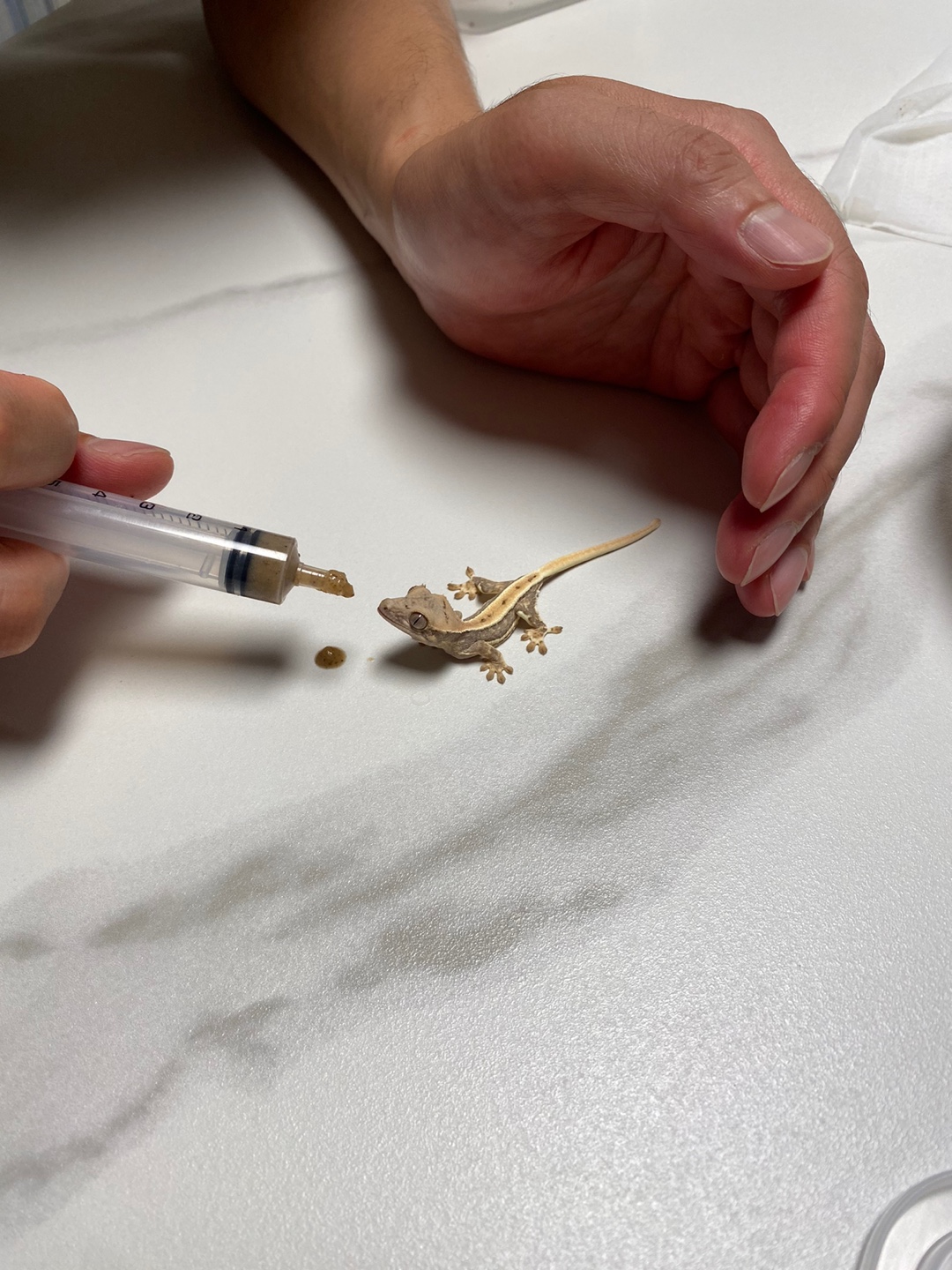 먹일 때 게코도마뱀은 턱에 먹이를 모아서 머리를 들어 넘기는데 이때 조금씩 나눠서 급여하는 것이 좋습니다